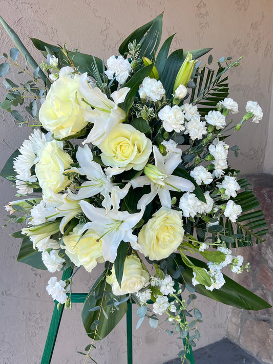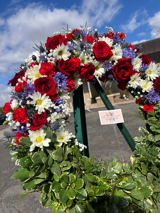 Patriotic Floral Standing Wreath- Red, White & Blue
