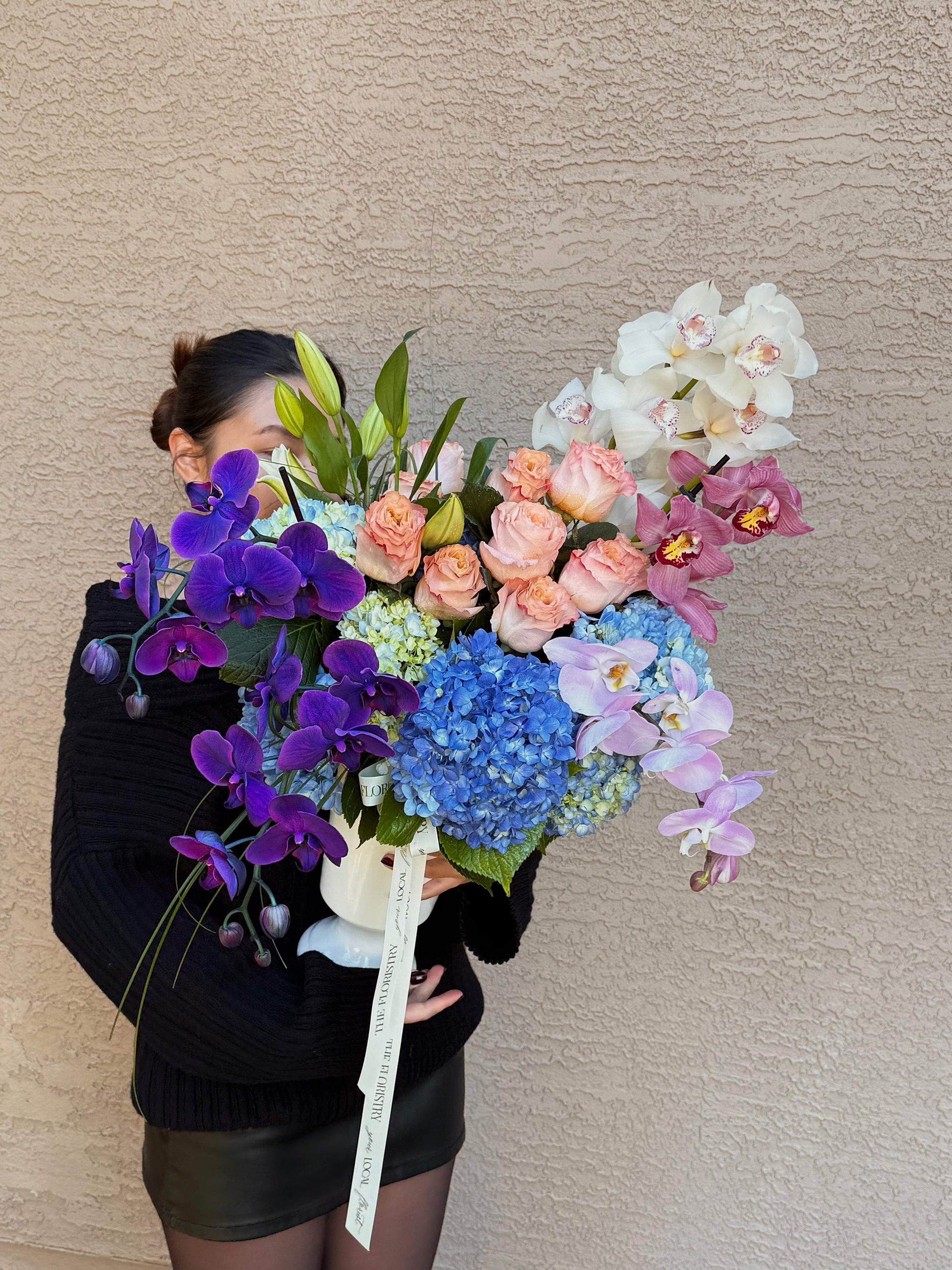 Queen of Art features an array of the finest hydrangeas, lilies, and exotic moon-colored orchids, each stem selected for its flawless form and breathtaking beauty. Meticulously arranged, this bouquet transcends ordinary floral design, it is a true art piece.