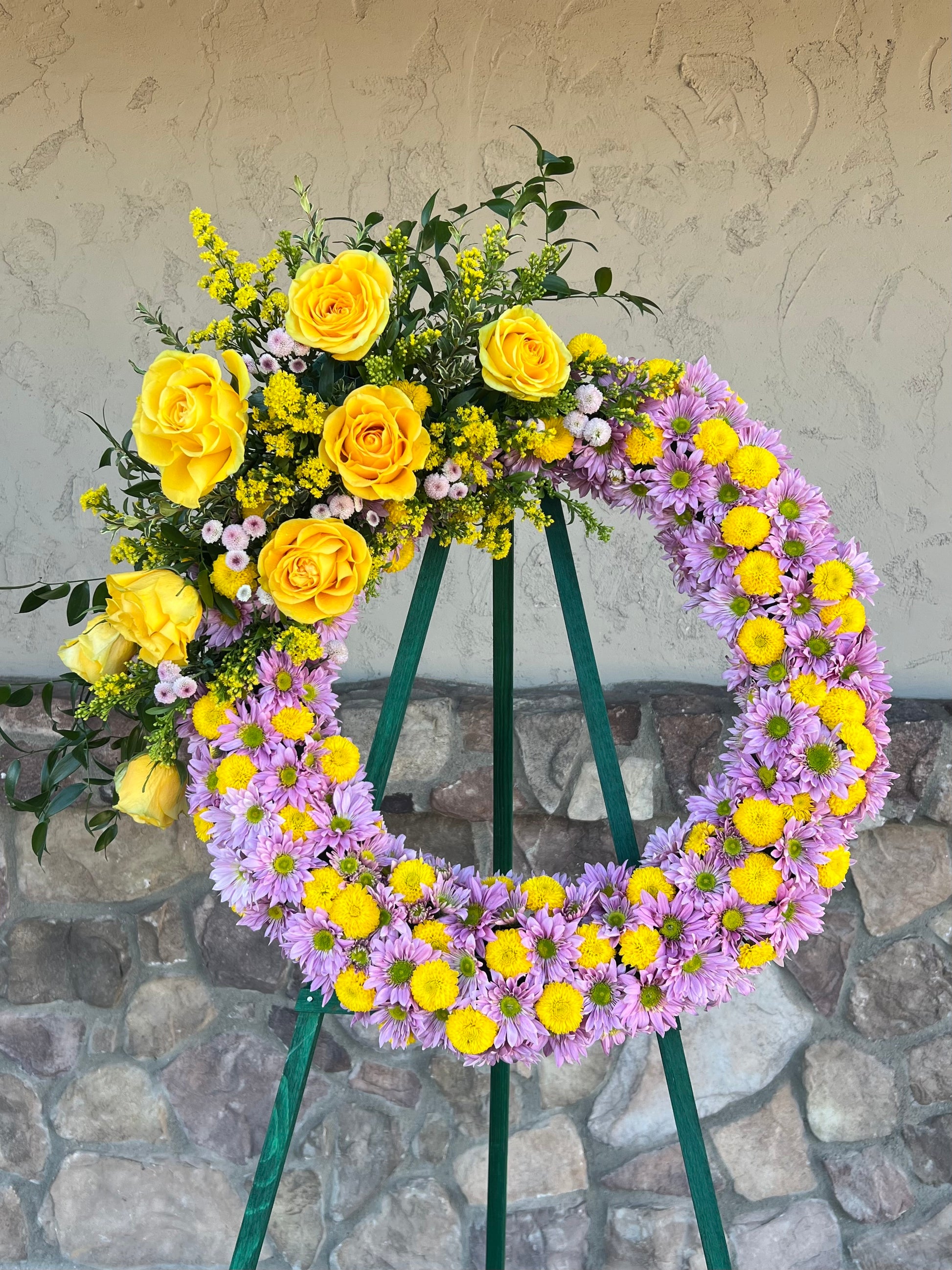 “阳光瀑布花架”将鲜艳的黄色和平静的紫色花朵和谐地融合在一起,营造出迷人的氛围,让人联想到阳光的温暖和薰衣草田的宁静。凭借其色彩和纹理的微妙平衡,这种布置散发出优雅和精致的气息,使其成为任何场合的完美杰作。