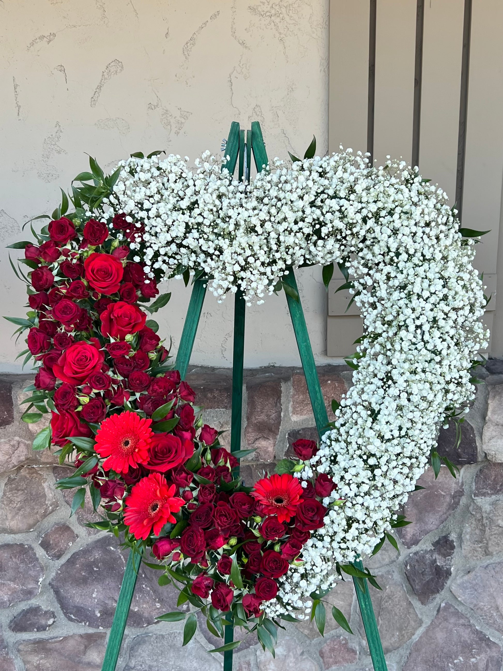 这款优雅的花架是一款引人注目的插花,融合了红玫瑰的古典之美、红雏菊的鲜艳魅力以及满天星的细腻触感。