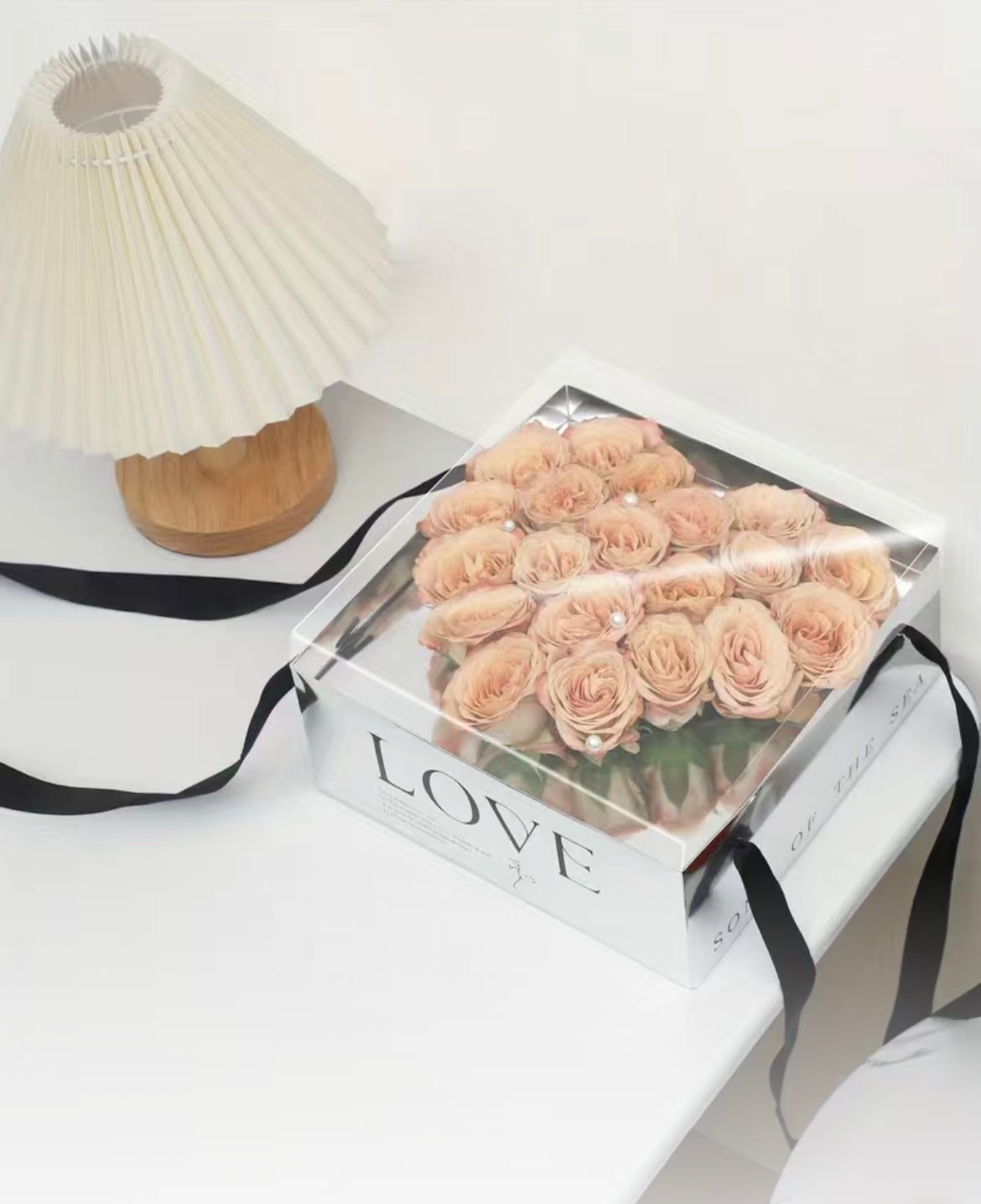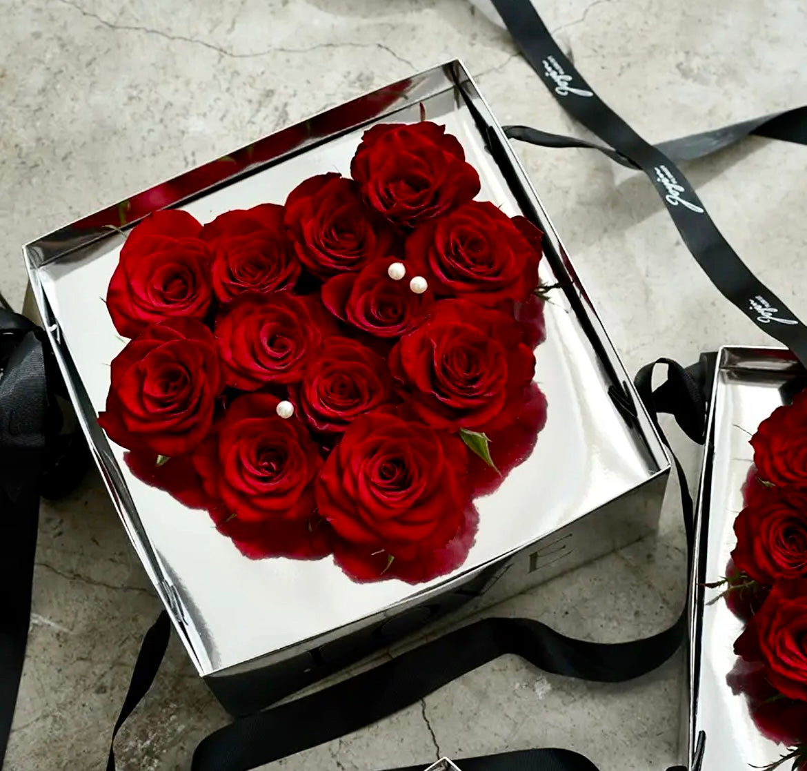 银色的魔法花盒散发着迷人的光芒,装饰着仿佛在月光下翩翩起舞的金属图案。盒内,一朵朵令人惊叹的玫瑰花组成了一颗完美的心形,花瓣反射出迷人的光芒,唤起一种超凡脱俗的美感。