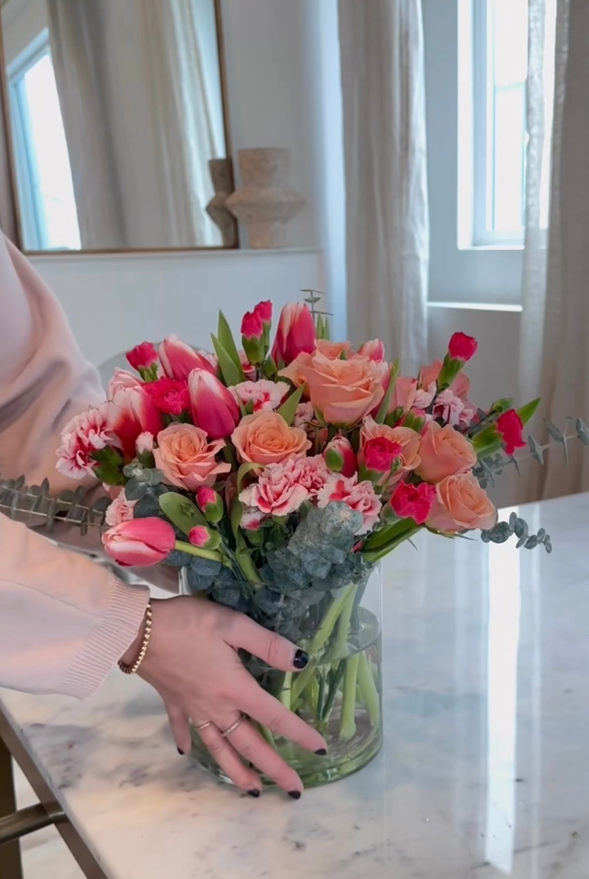用最色彩缤纷的花束点亮某人的一天。它由郁金香、玫瑰、康乃馨和一些绿色植物混合而成,色调欢快,有粉色、红色、珊瑚色和桃红色。