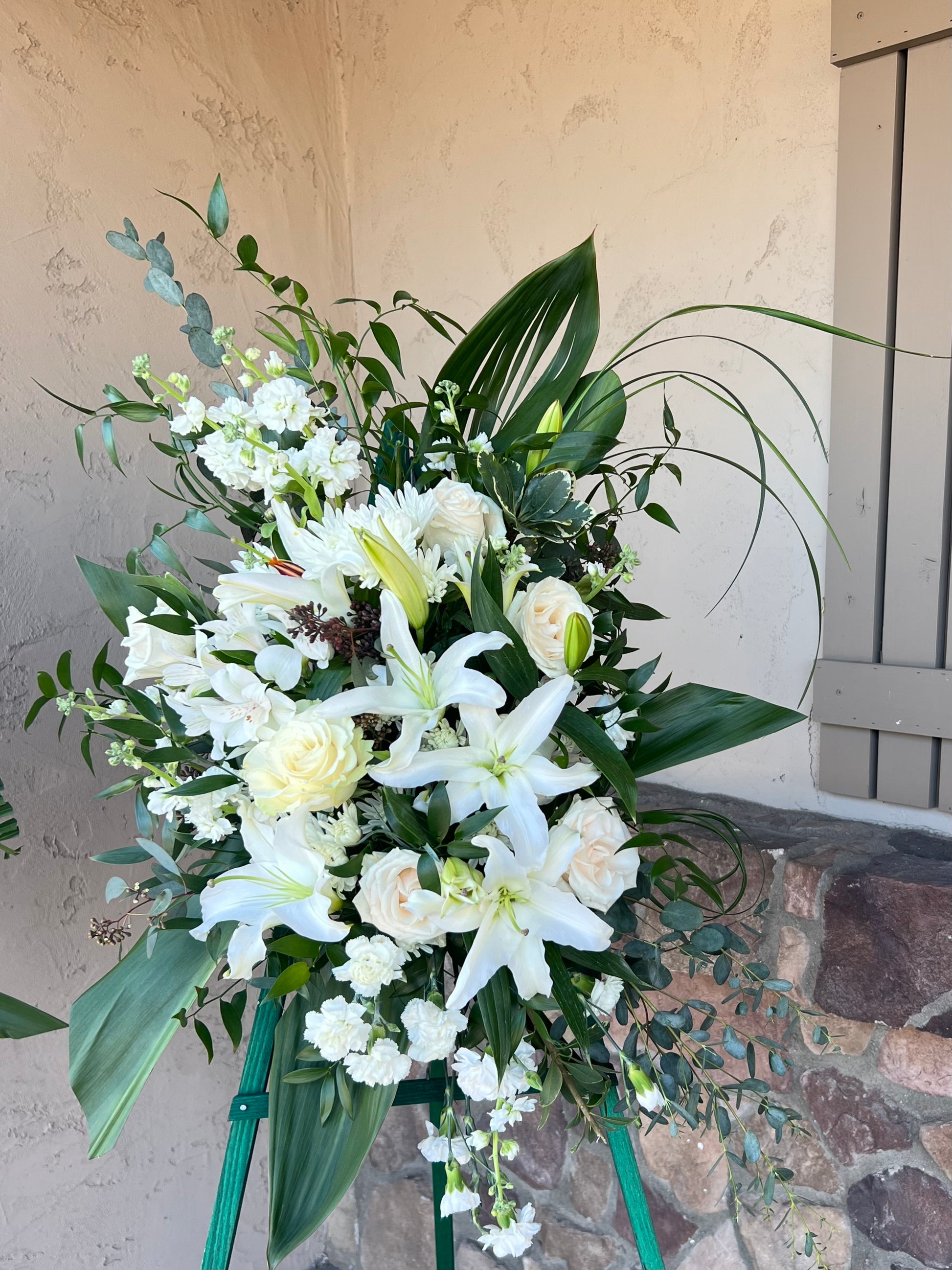 优雅别致的花卉慰问祈祷,包括白玫瑰、康乃馨、菊花、金鱼草和蒙特卡西诺。由花店手工布置,是送给所爱之人的经典礼物。